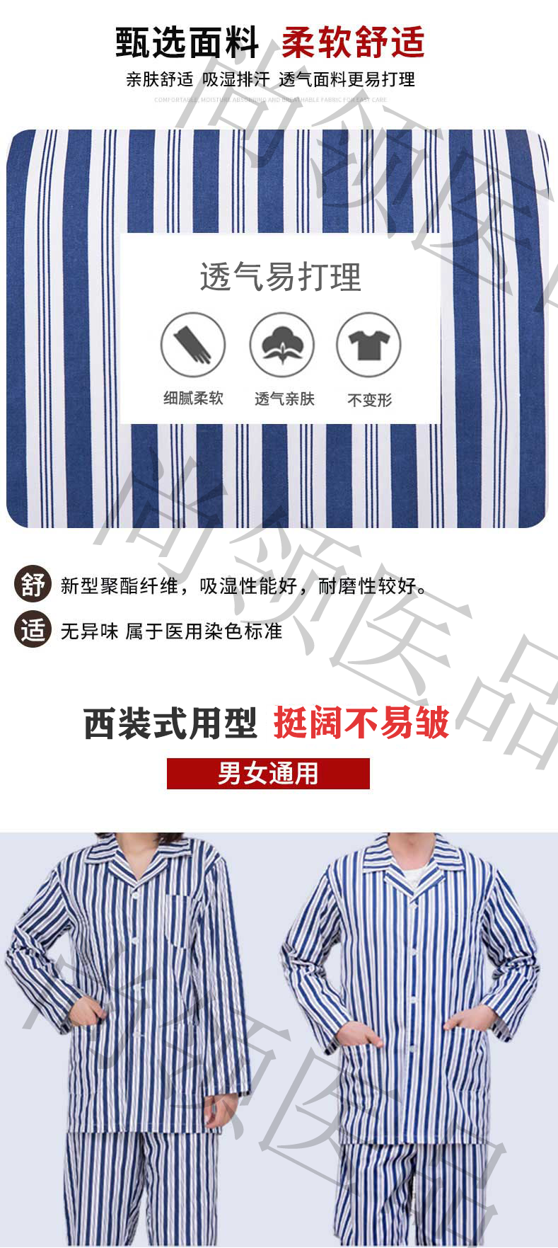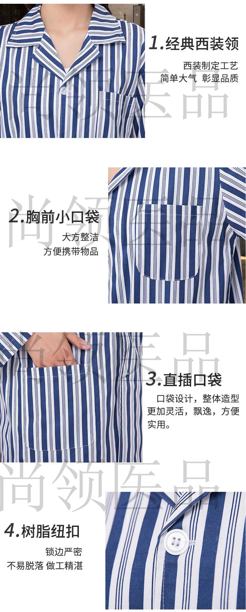 藍白條紋病員服是最常見的款式,在各大醫(yī)院里都能看到。采用了西裝領口簡潔大方,簡潔的袖口便于穿著,側面有口袋,既可裝飾又可儲物。