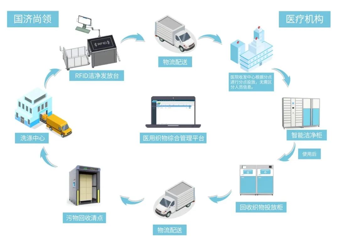 在國(guó)濟(jì)尚領(lǐng),每件醫(yī)用織物都有自己專(zhuān)屬的“身份證”——獨(dú)立的芯片系統(tǒng)。作為醫(yī)療機(jī)構(gòu)院感防控的重要環(huán)節(jié)物品,從醫(yī)院開(kāi)始裝車(chē)到最后洗滌干凈送回醫(yī)院,中間任何過(guò)程都可隨時(shí)查看。